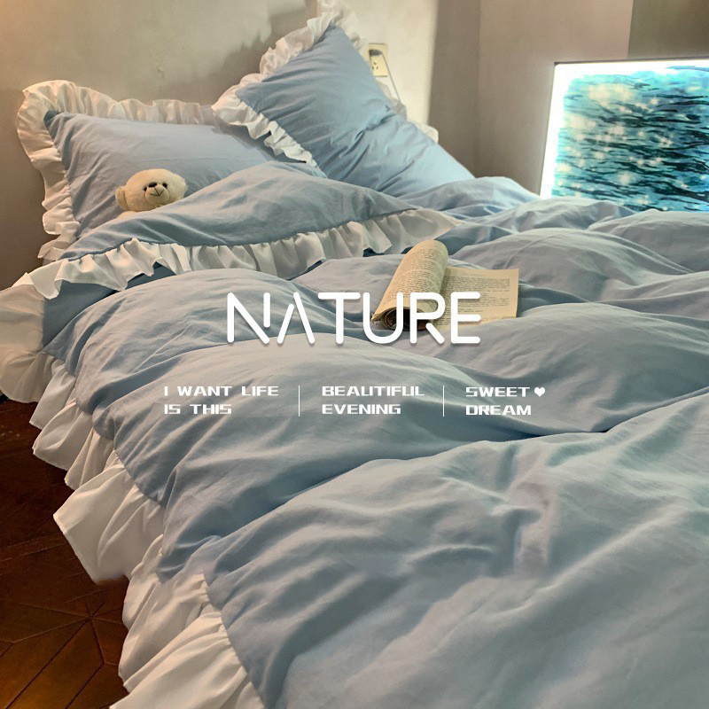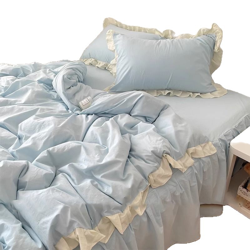 S纯色被套蓝色床单三件套花边ins柔软水洗棉四件套荷叶床品公主风 1件
