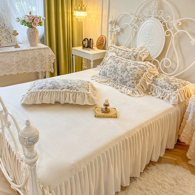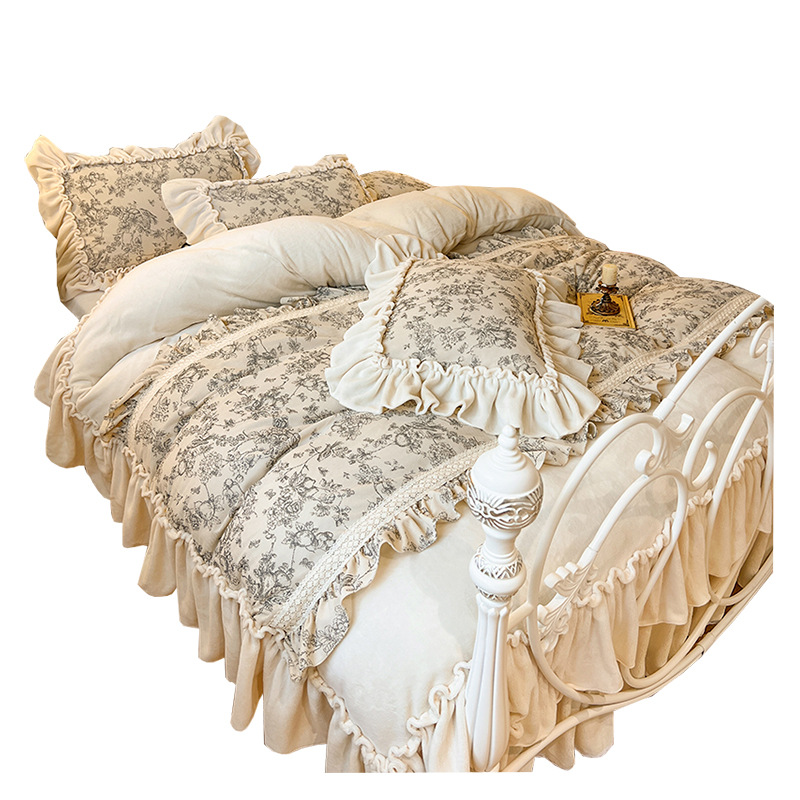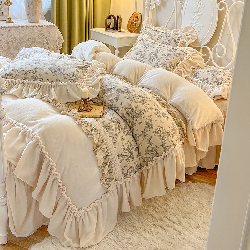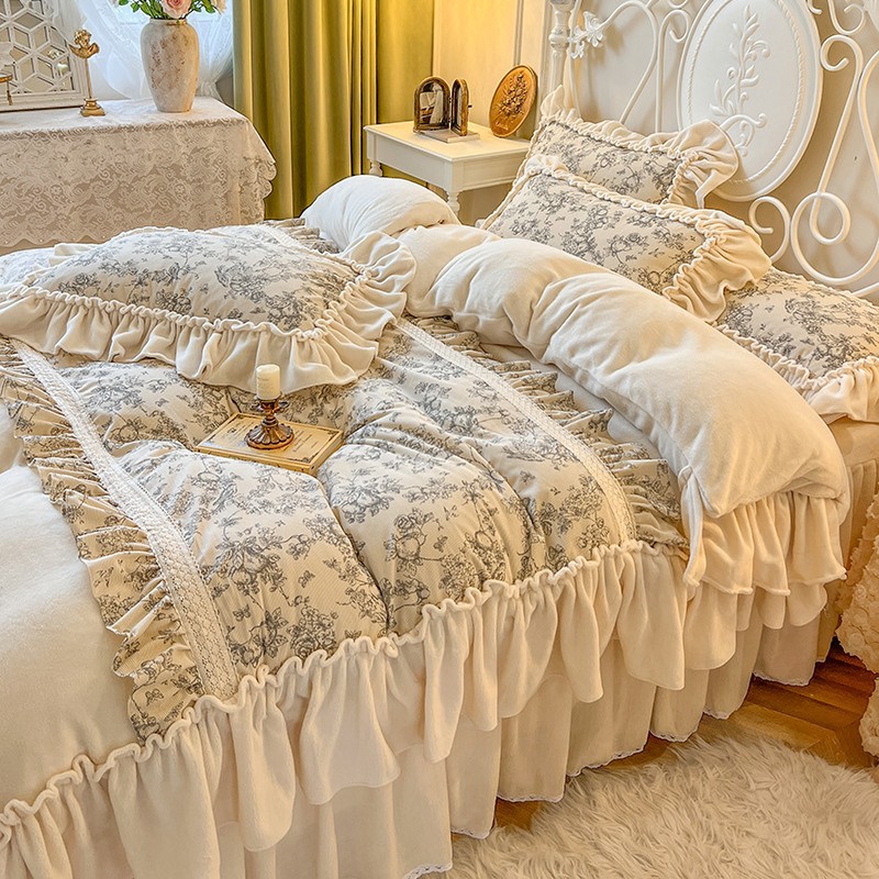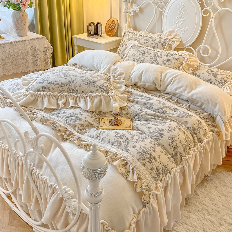 法式田园花卉牛奶绒床上四件套公主风褶皱花边珊瑚绒被套仙女床裙 1套