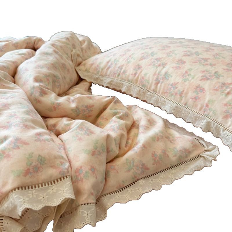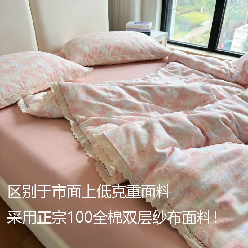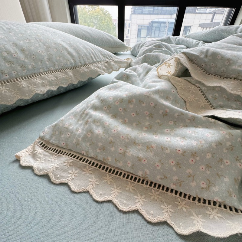 A类全棉双层纱布四件套法式蕾丝边碎花纯棉花边被套床单宿舍床品4 1套