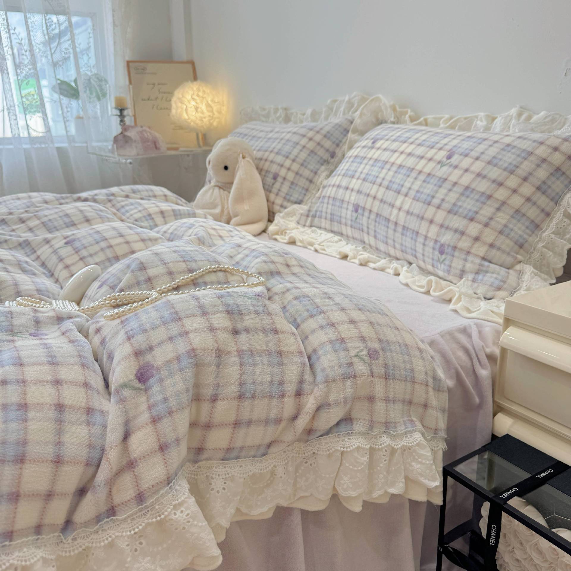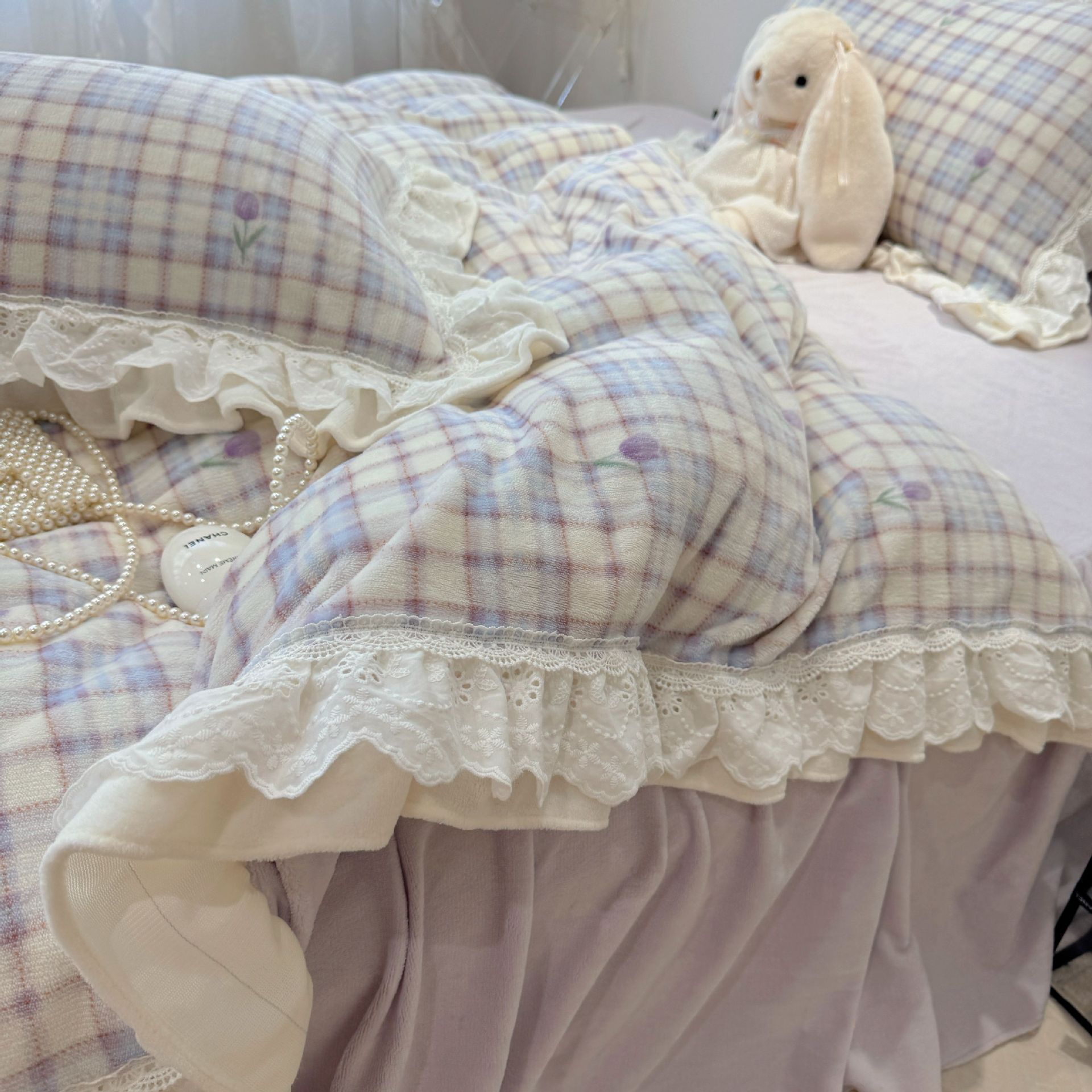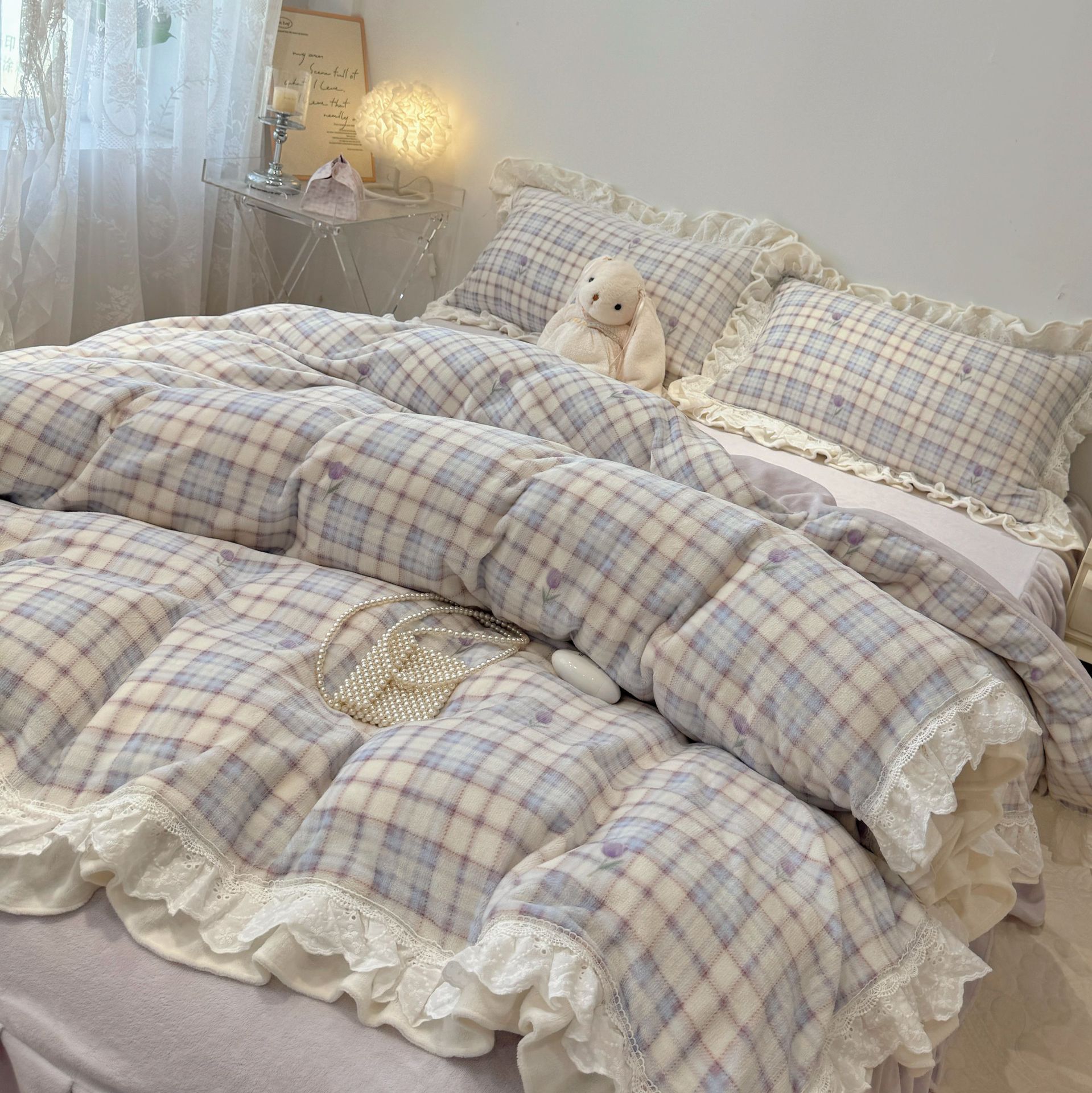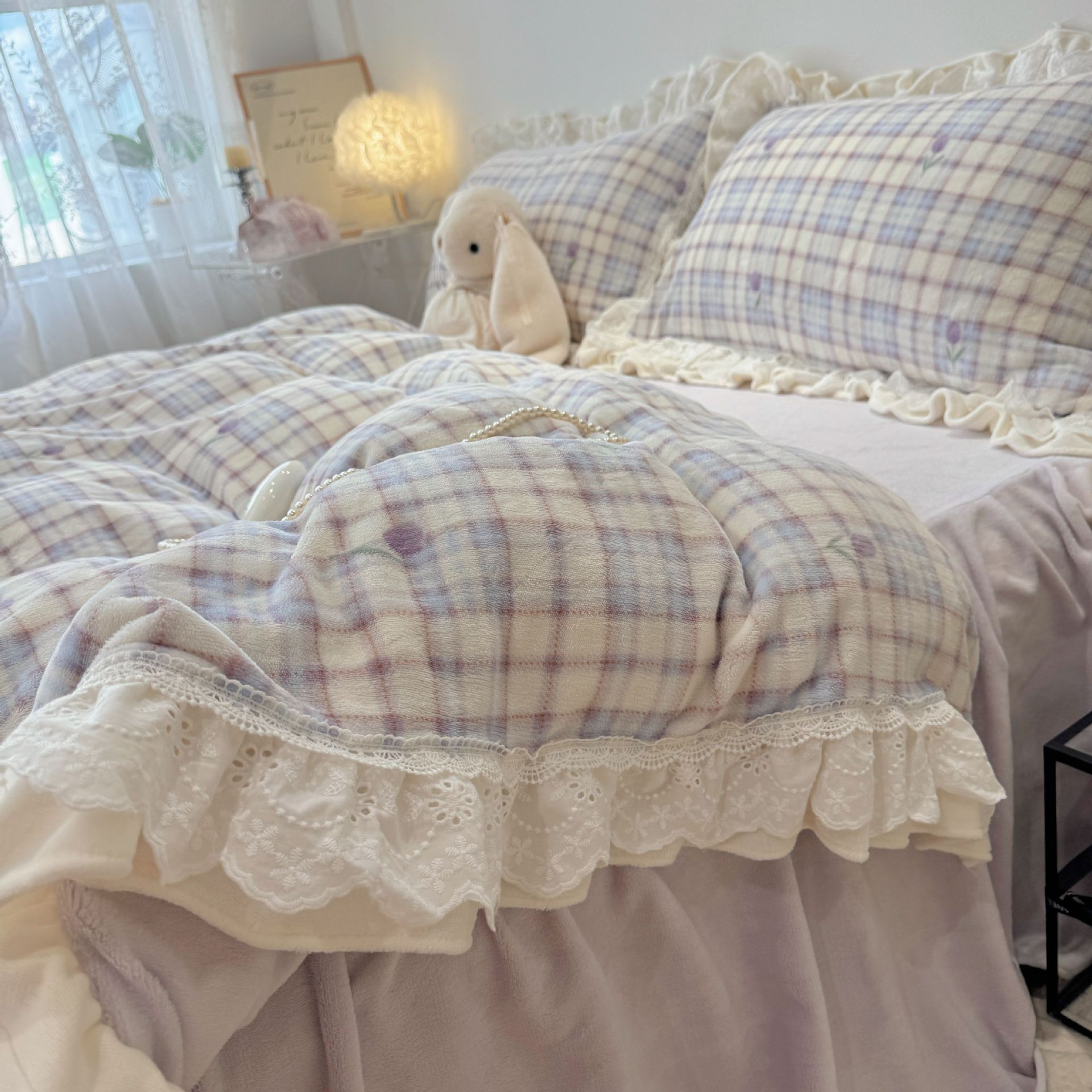 韩系少女风牛奶绒花边款四件套秋冬加厚床裙款三件套床上用品加绒 1套