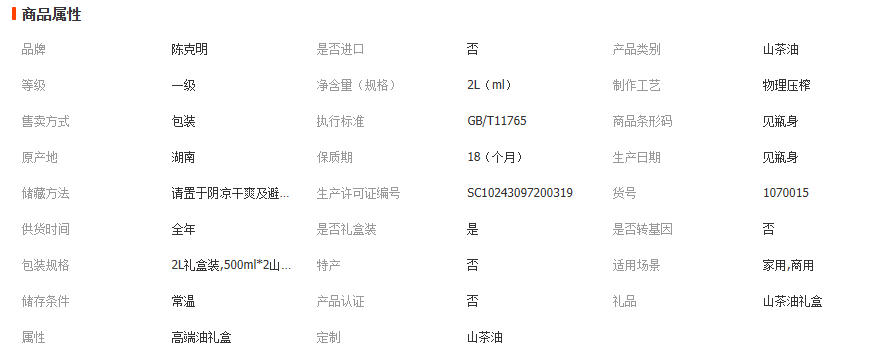 陈克明山茶油礼盒纯正农家茶油2L桶装食用油家用送礼商用高端礼品 1盒