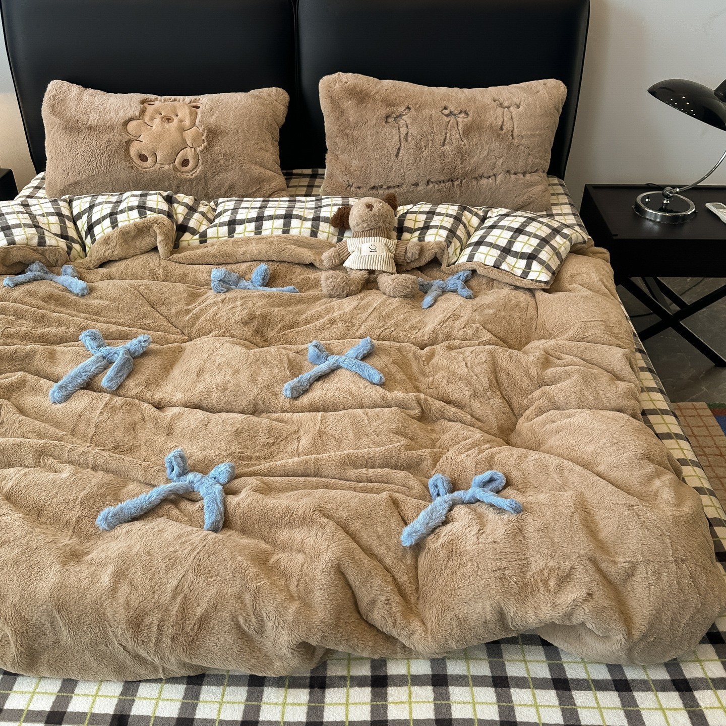 冬季小清新柔软兔兔绒立体蝴蝶结蓝色四件套爆款牛奶绒床单被保暖 1套