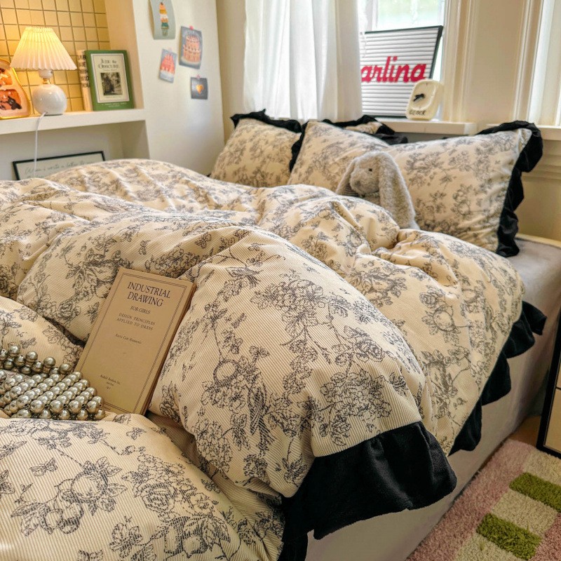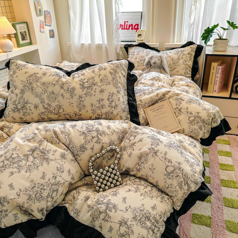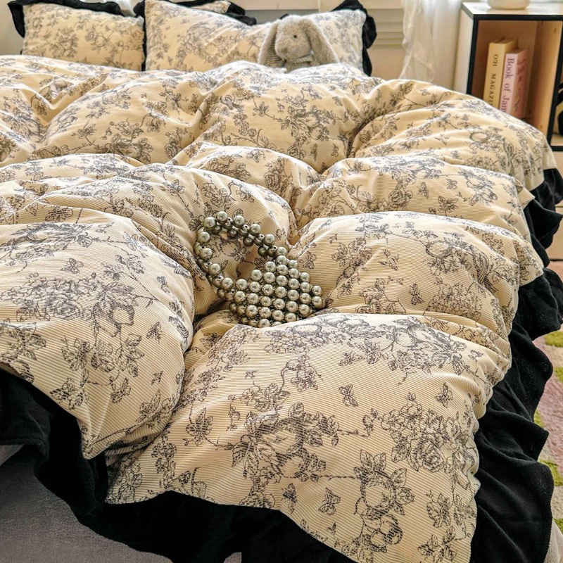 2025新款轻法式赫本风灯芯绒牛奶绒四件套立体韩版花边复古牛奶绒 1套