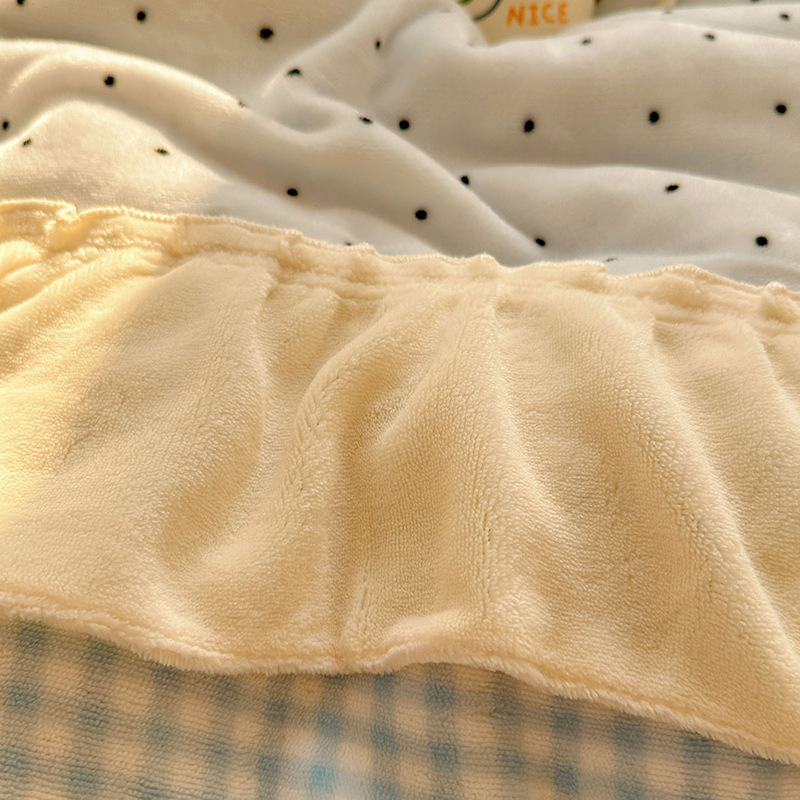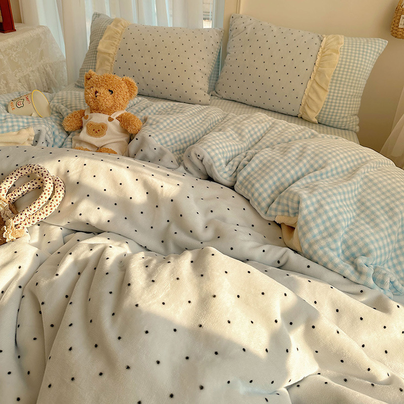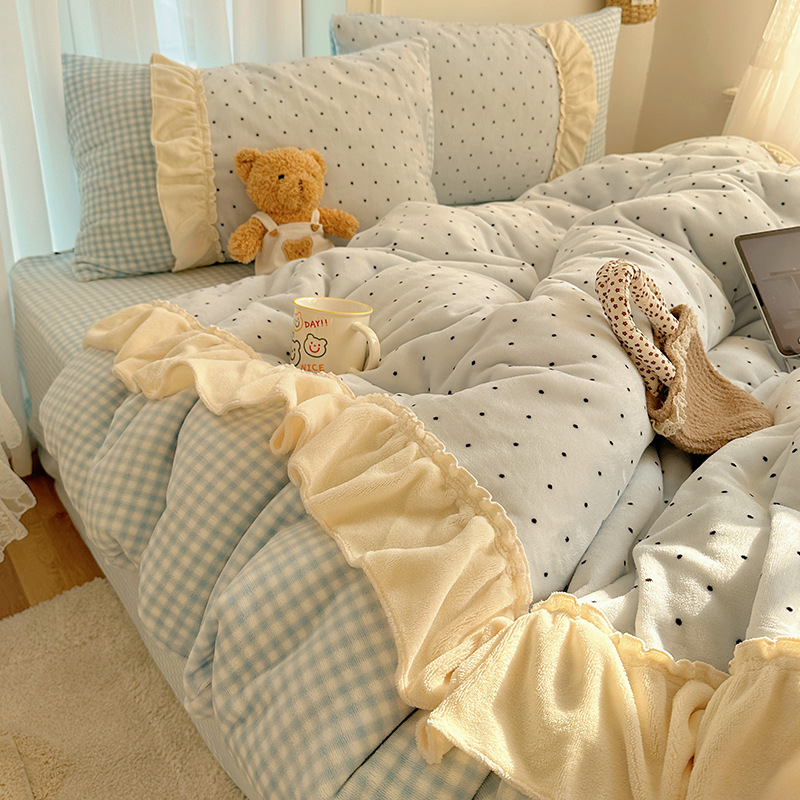 奶呼呼波点拼接花边牛奶绒保暖四件套少女心双面绒被套法兰床单笠 1套