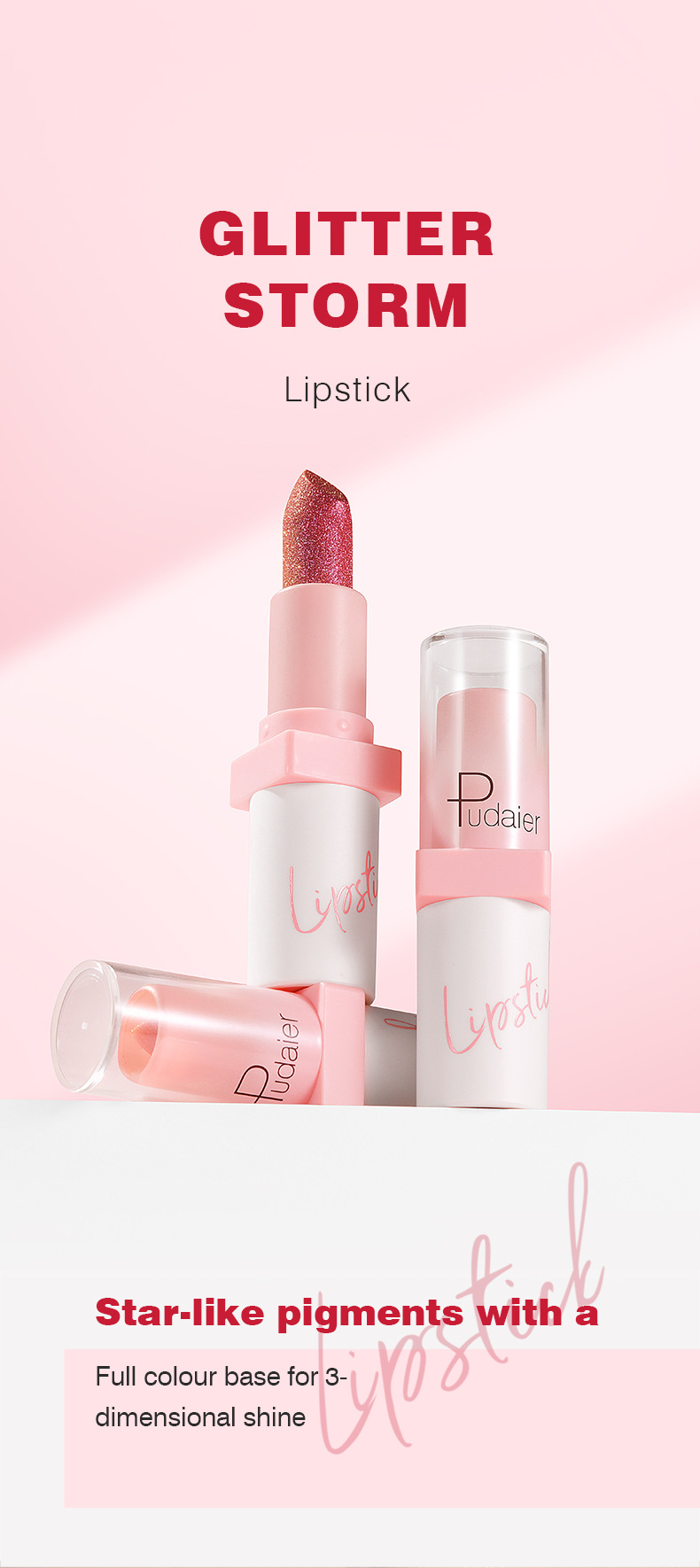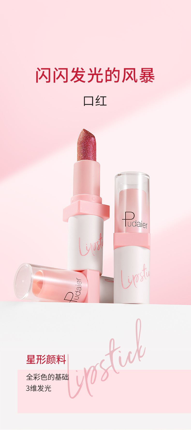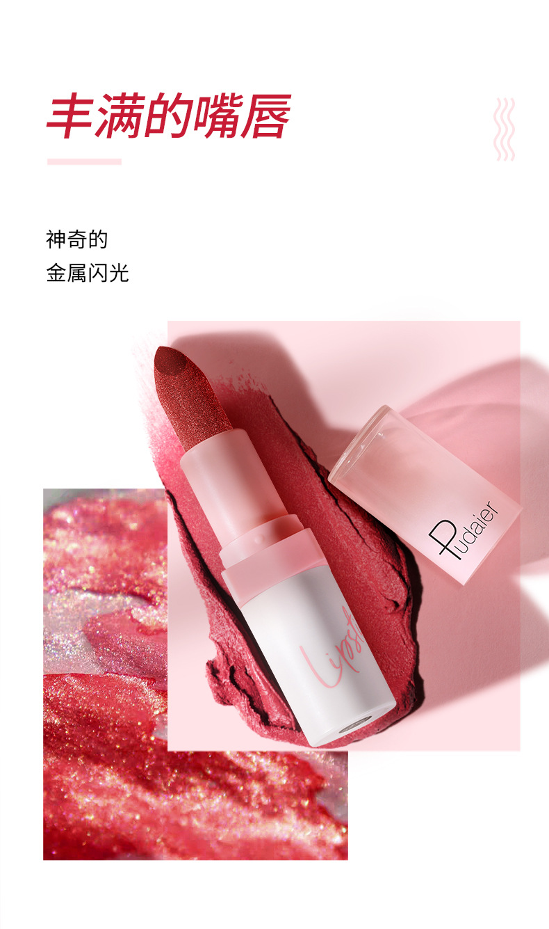 跨境彩妆Pudaier闪亮金属珠光口红10色雾面不沾杯唇釉欧美唇彩