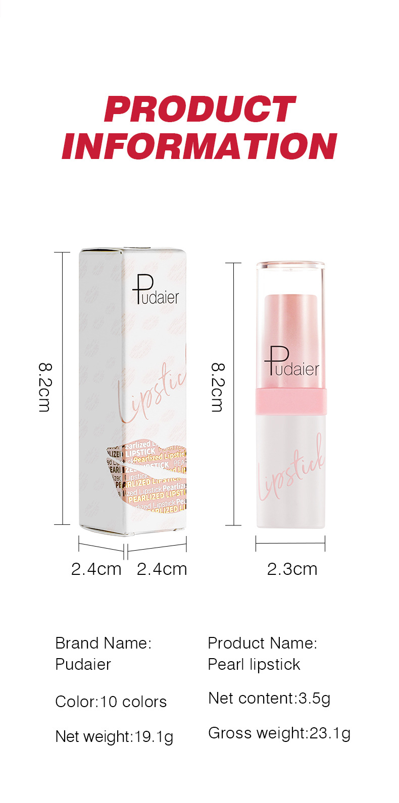 净含量:3.5g 净重:19.1g 毛重:23.1g 产品尺寸:2.3*8.2cm 包装尺寸:2.4*2.4*8.2cm 箱规:51打✖12=612支/件,53.5x24x27cm,重量:14.75kg