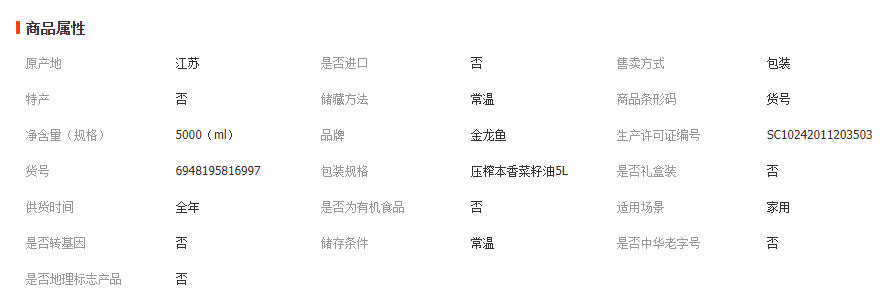 金龙鱼压榨本香菜籽油5L食用油 非转基因物理压榨 家用大桶装菜油