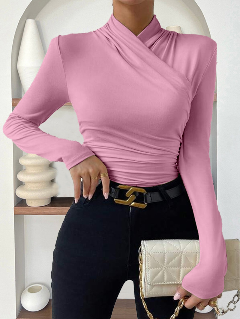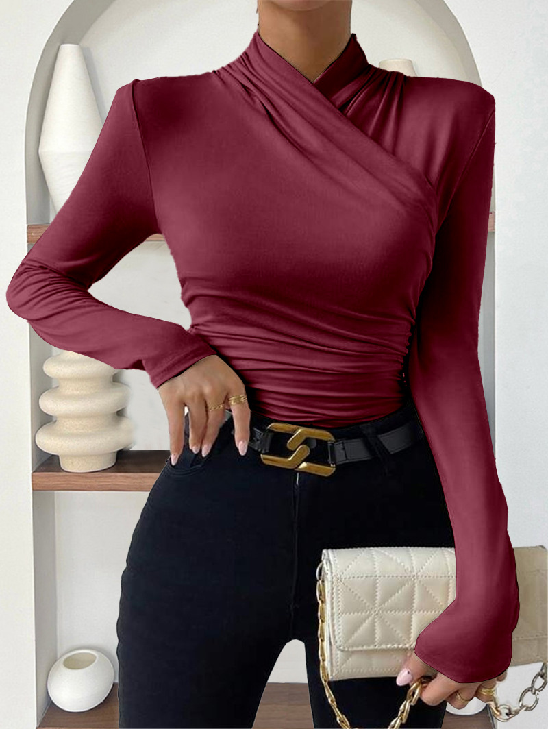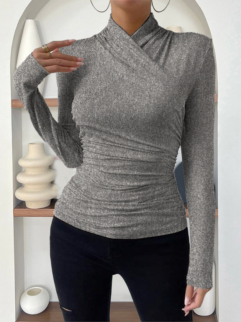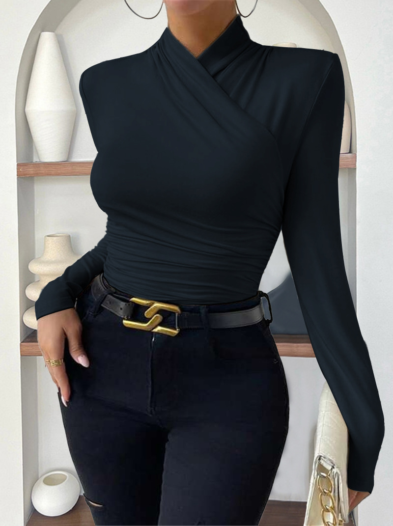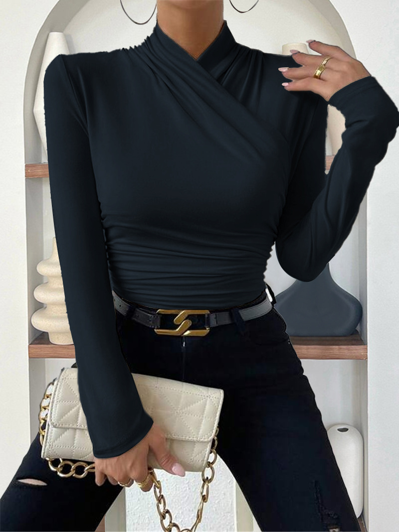 欧美跨境套头秋冬新款设计感交领长袖修身百搭纯色抽褶T恤