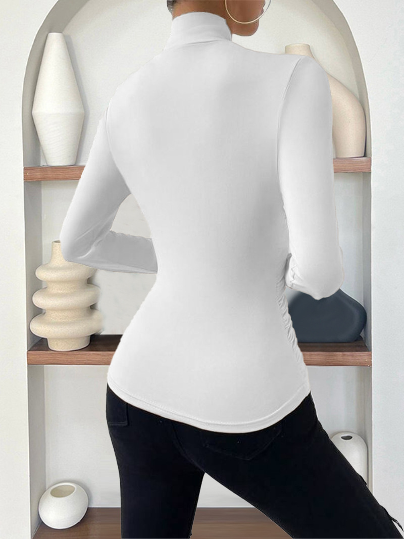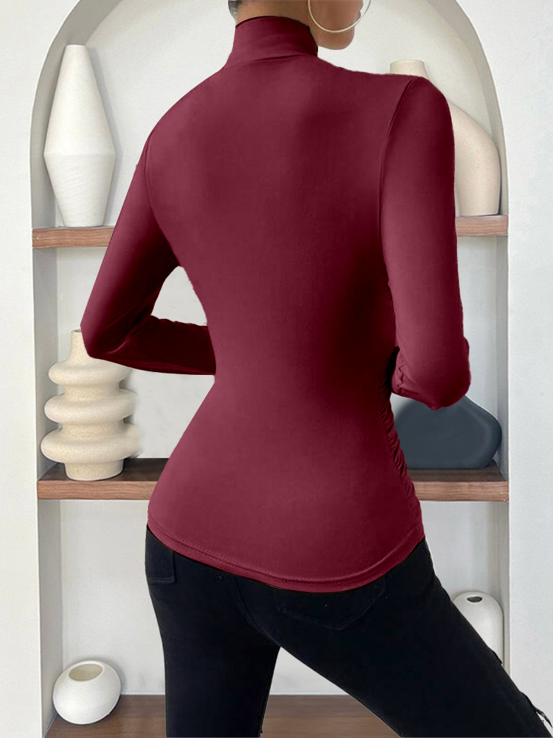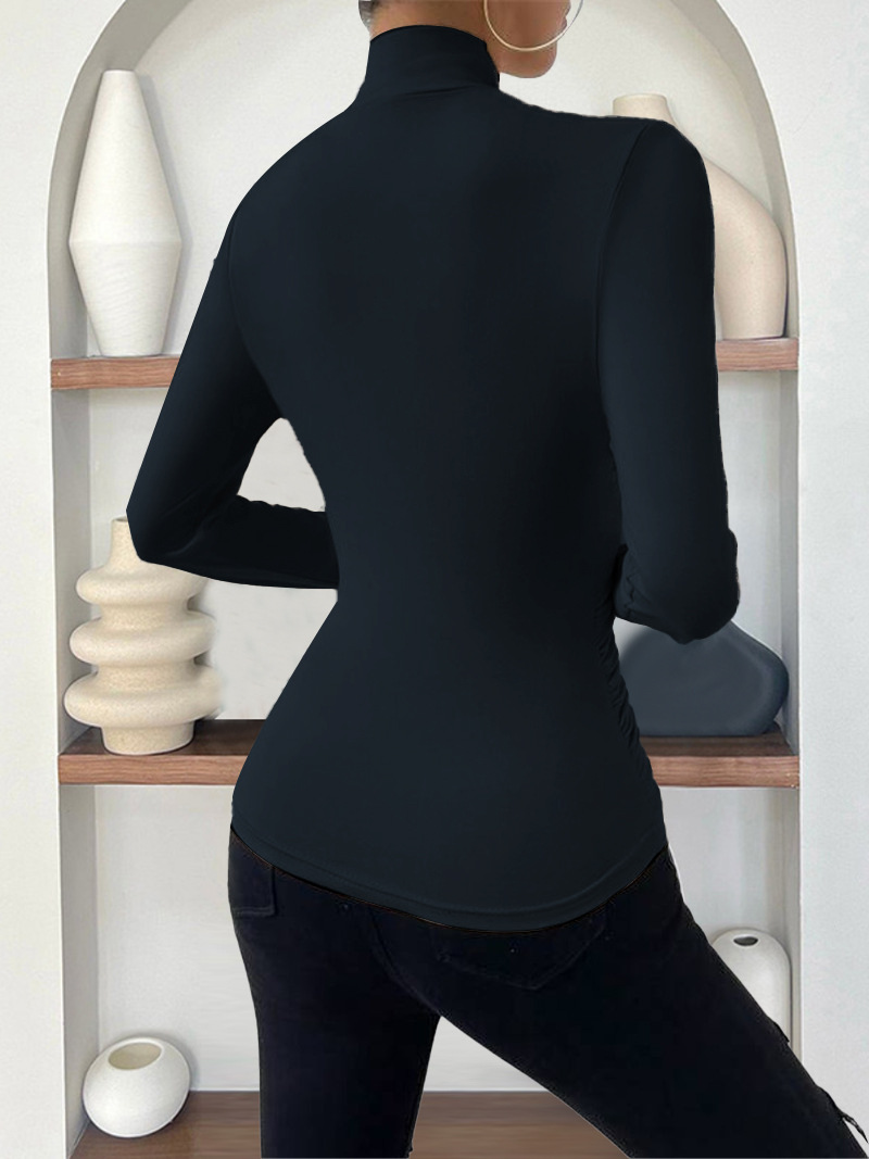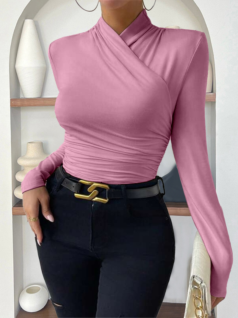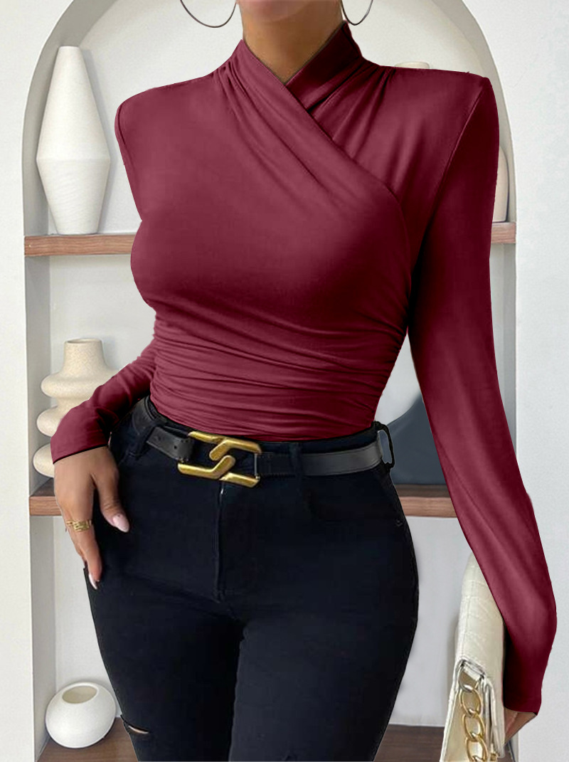 欧美跨境套头秋冬新款设计感交领长袖修身百搭纯色抽褶T恤