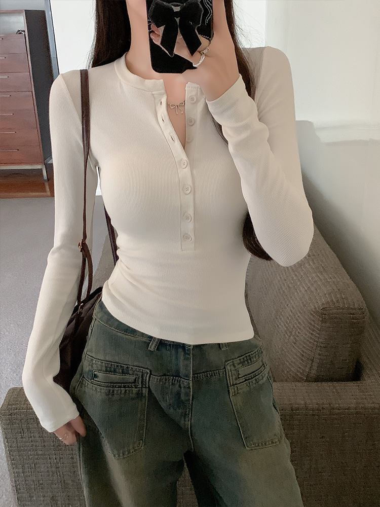 辣妹紧身正肩长袖T恤女2025新款春秋打底衫显瘦内搭纽扣学生上衣
