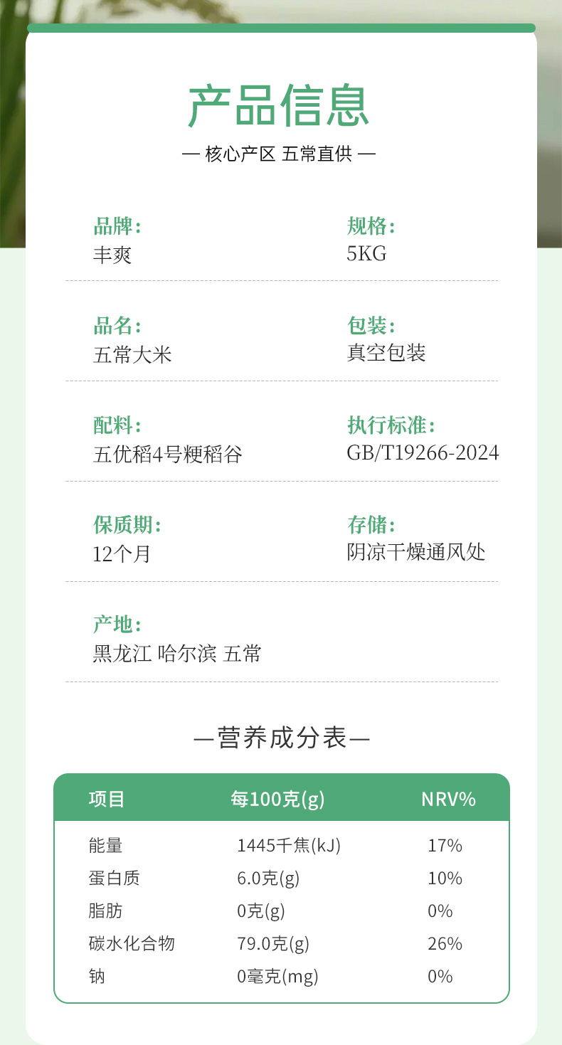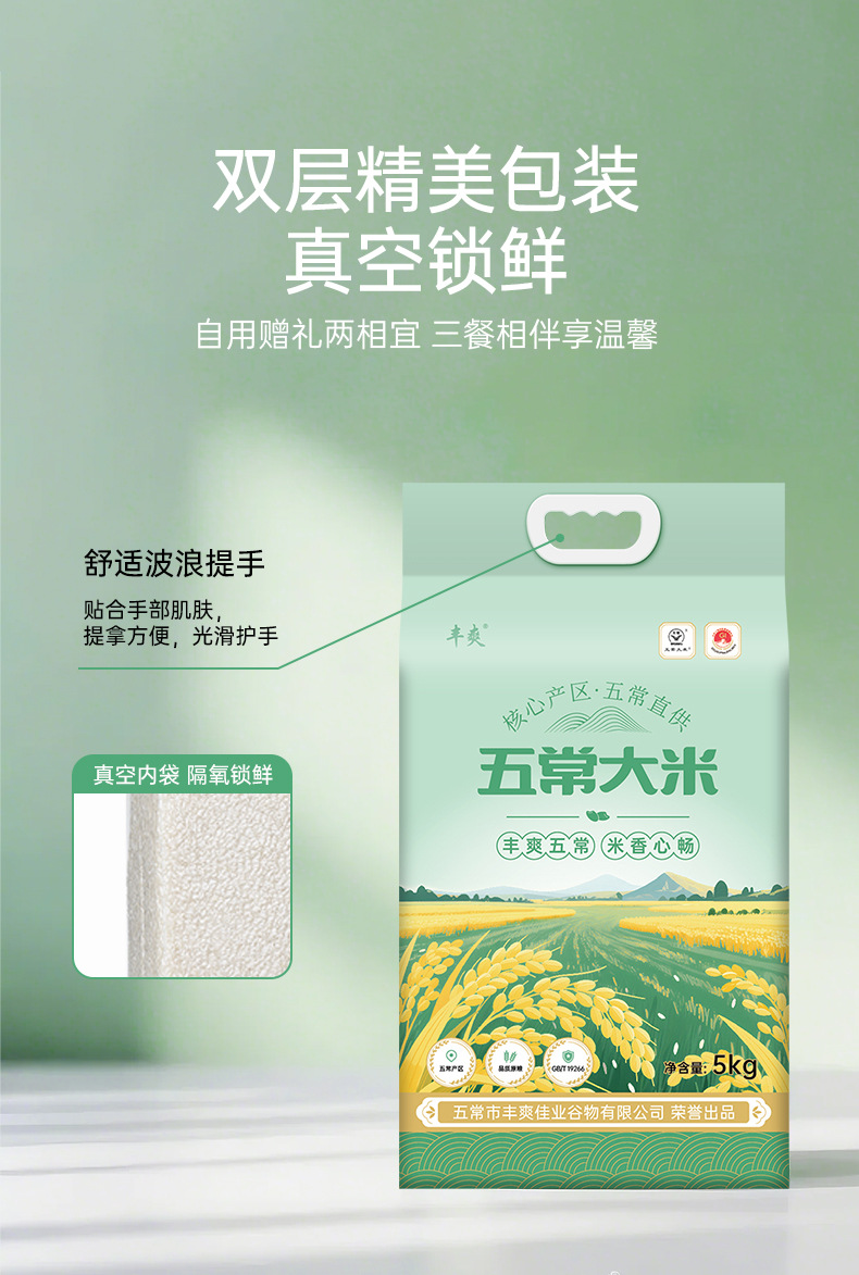 丰爽绿袋东北五常大米10斤稻花香2号 龙凤核心双层真空装大米5kg