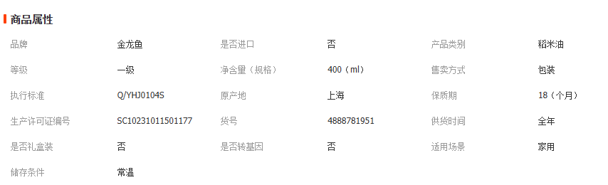 金龙鱼 双一万稻米油400ml 谷维素米糠油