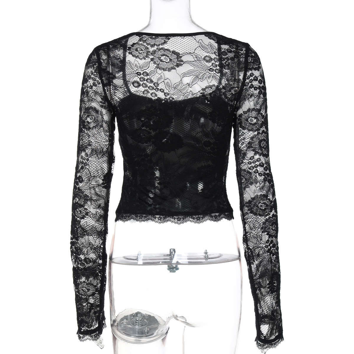 欧美跨境夏季新品时尚性感蕾丝镂空拼接长袖上衣性感辣妹女T桖