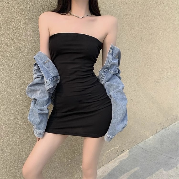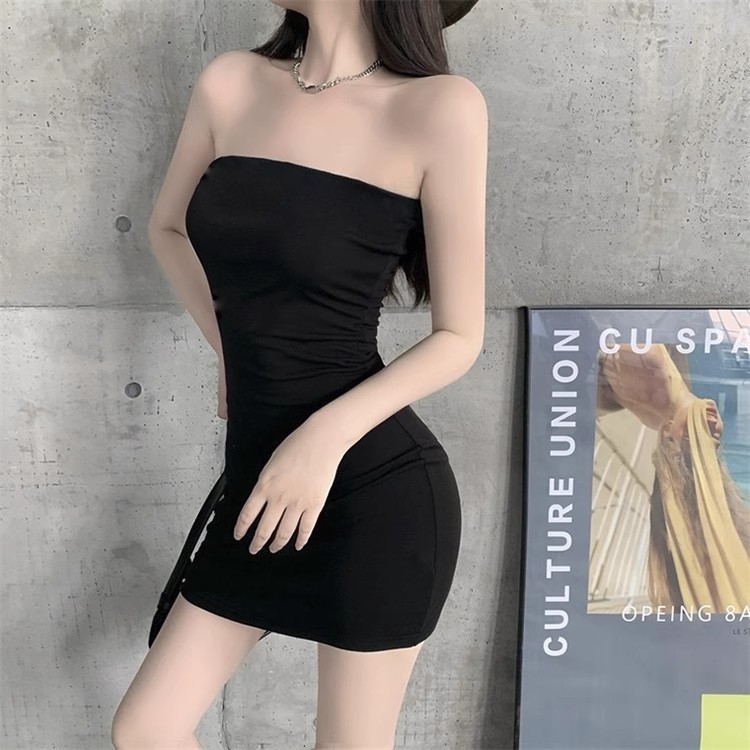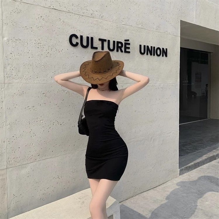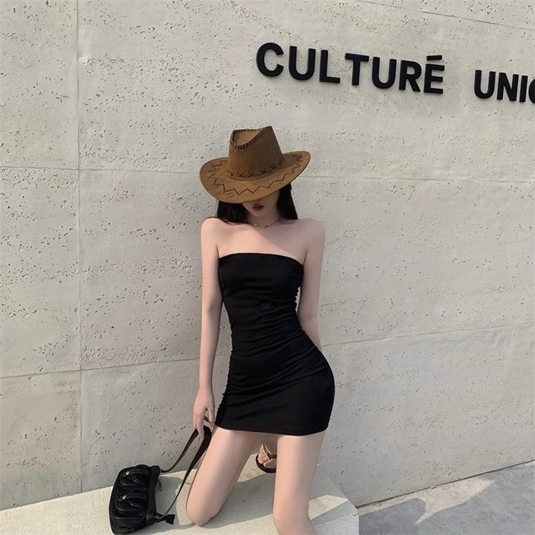 黑色一字领修身抹胸连衣裙女2025年新款春夏性感收腰包臀裙子