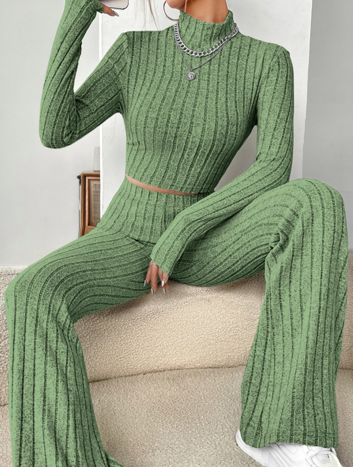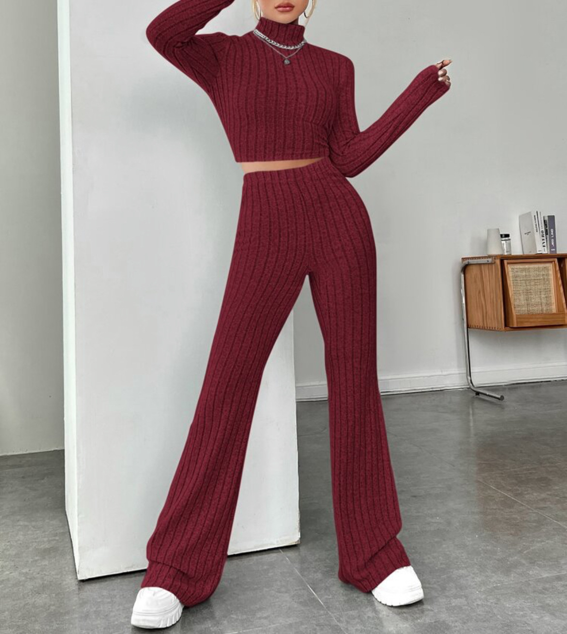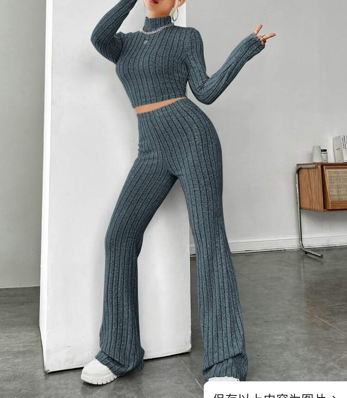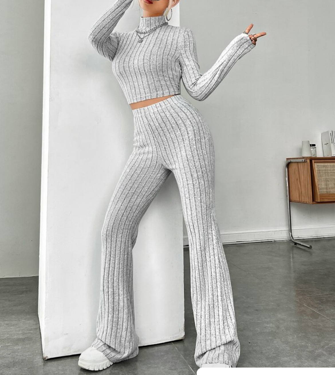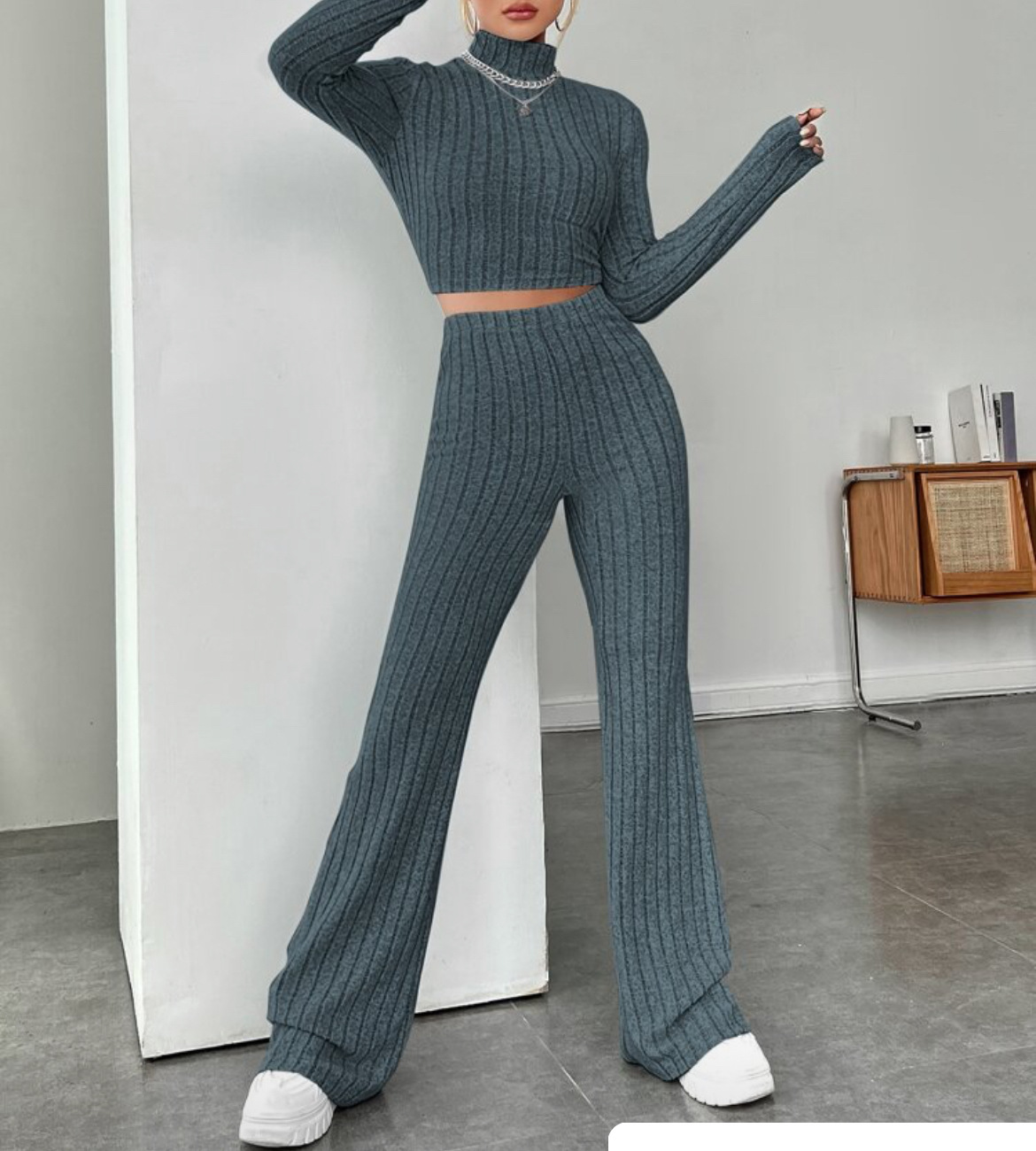 欧美新款2023秋冬季时尚纯色针织长袖高领衫阔腿高腰长裤套装