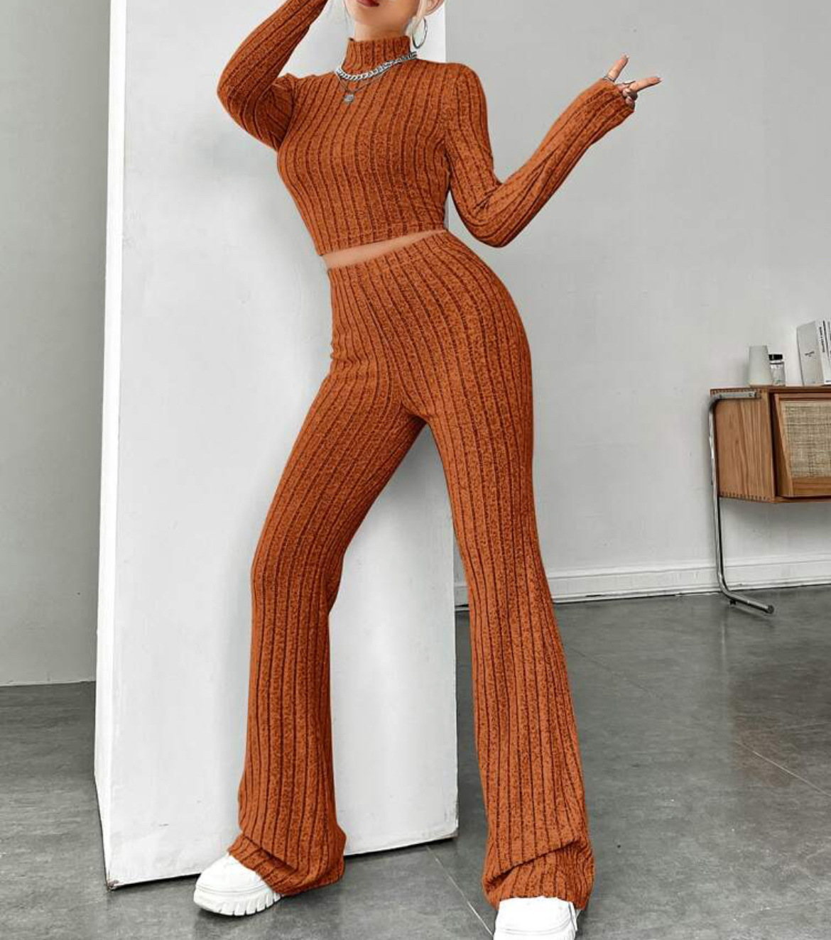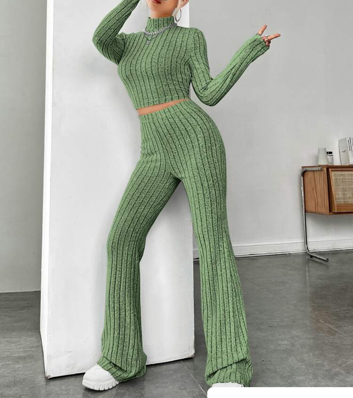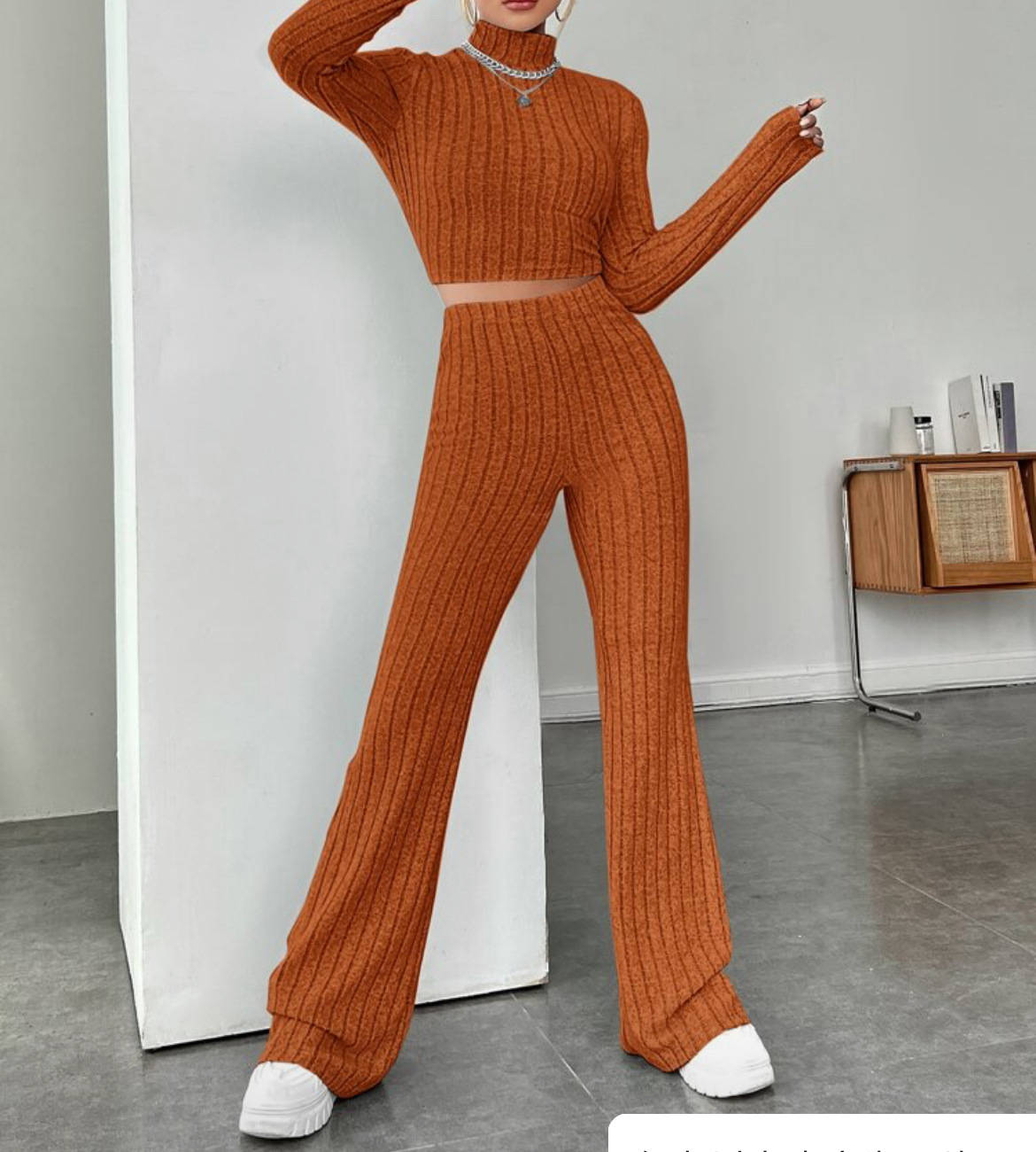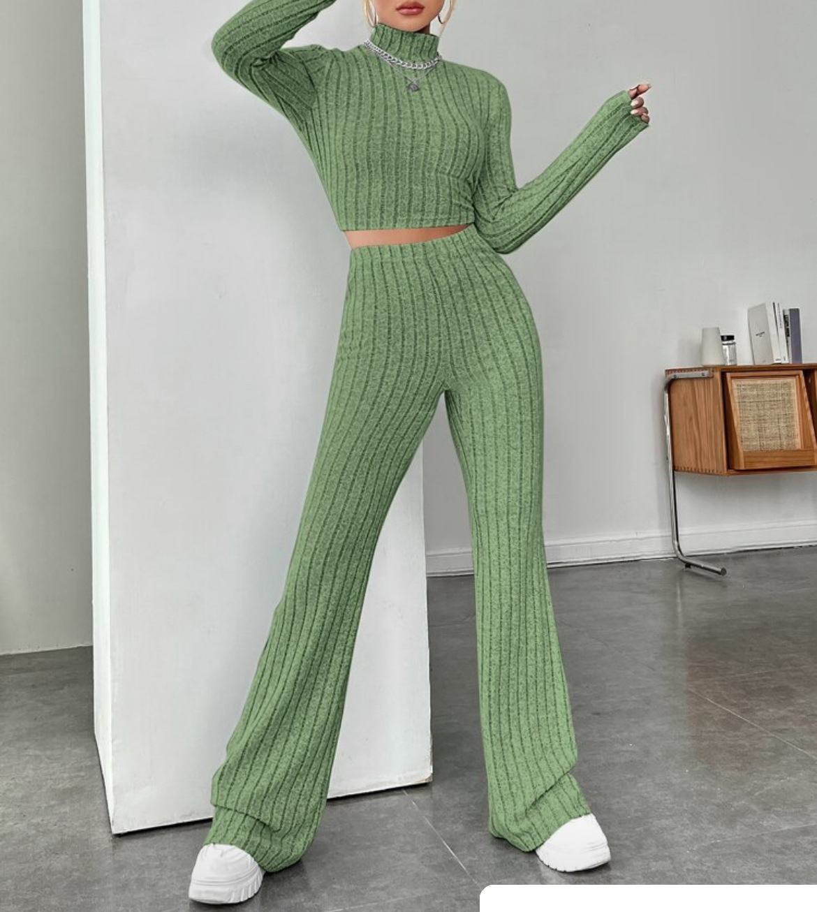 欧美新款2023秋冬季时尚纯色针织长袖高领衫阔腿高腰长裤套装