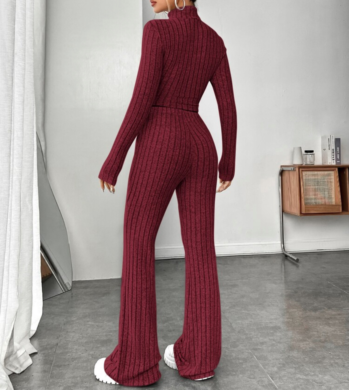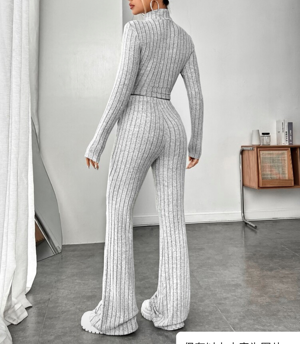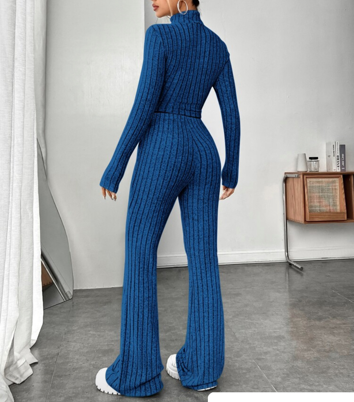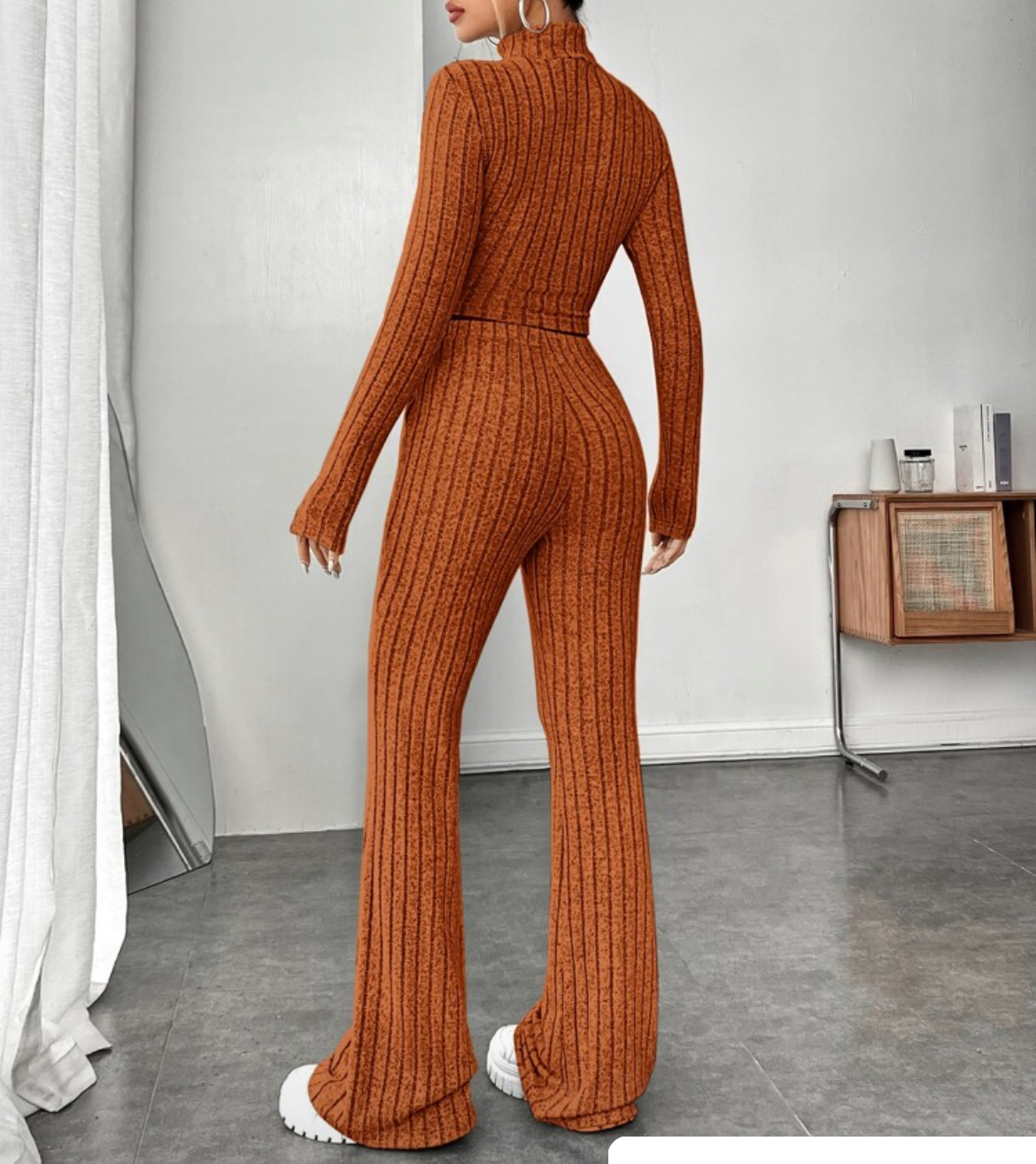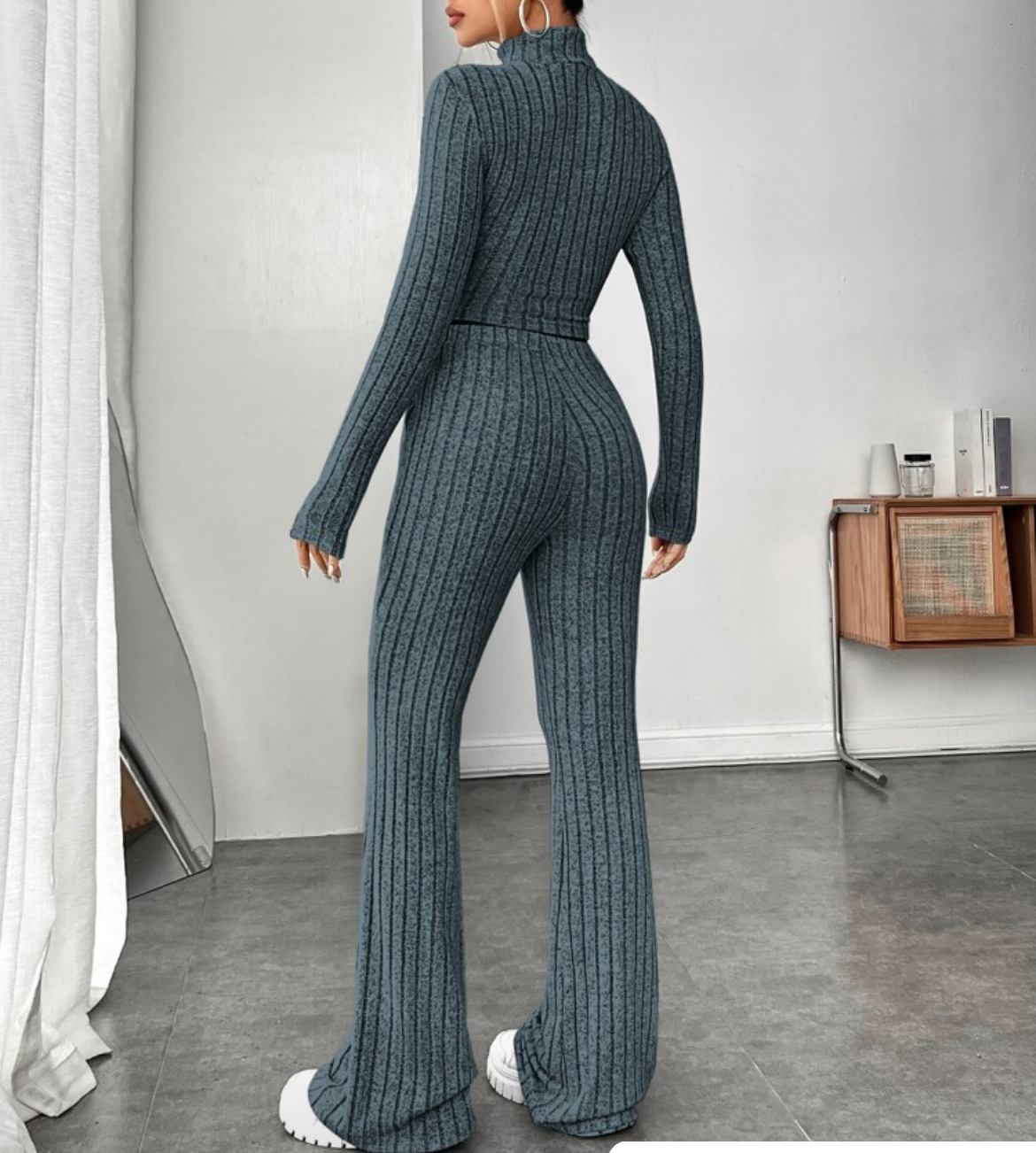 欧美新款2023秋冬季时尚纯色针织长袖高领衫阔腿高腰长裤套装