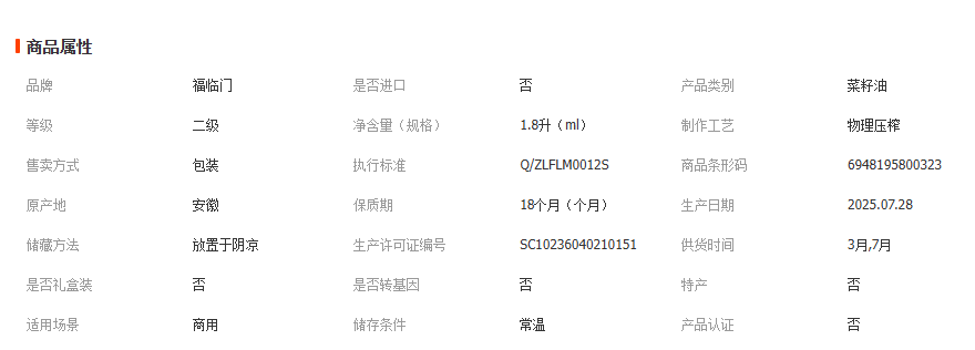 福临门 低芥酸菜籽油1.8L整箱6瓶装组合团购房产保险活动礼品