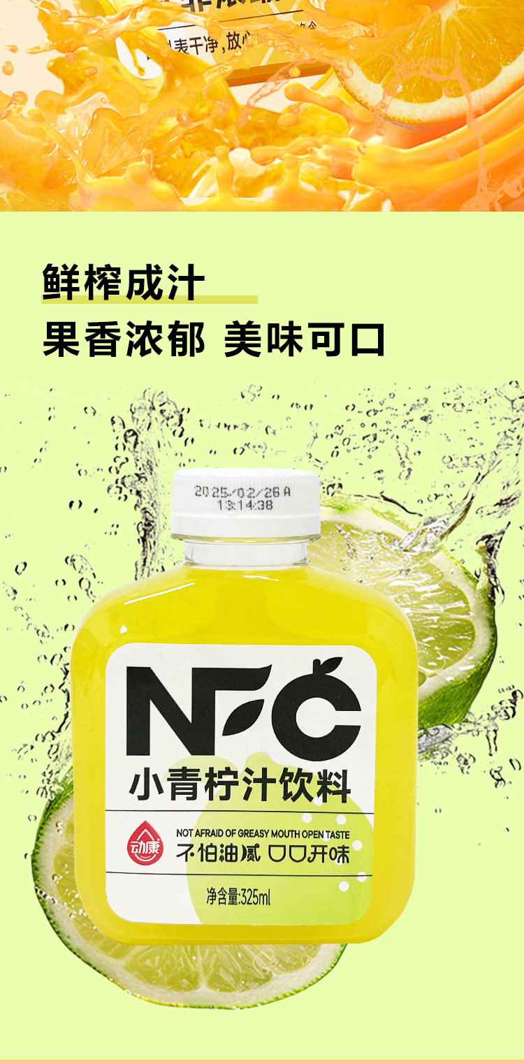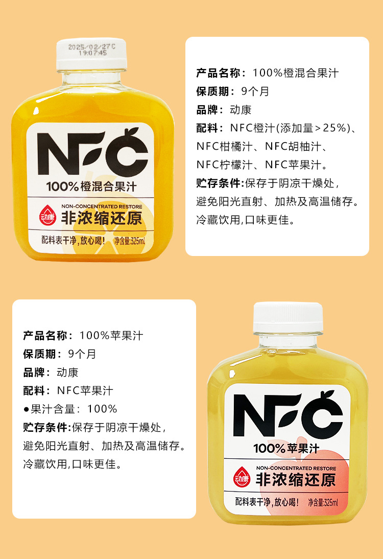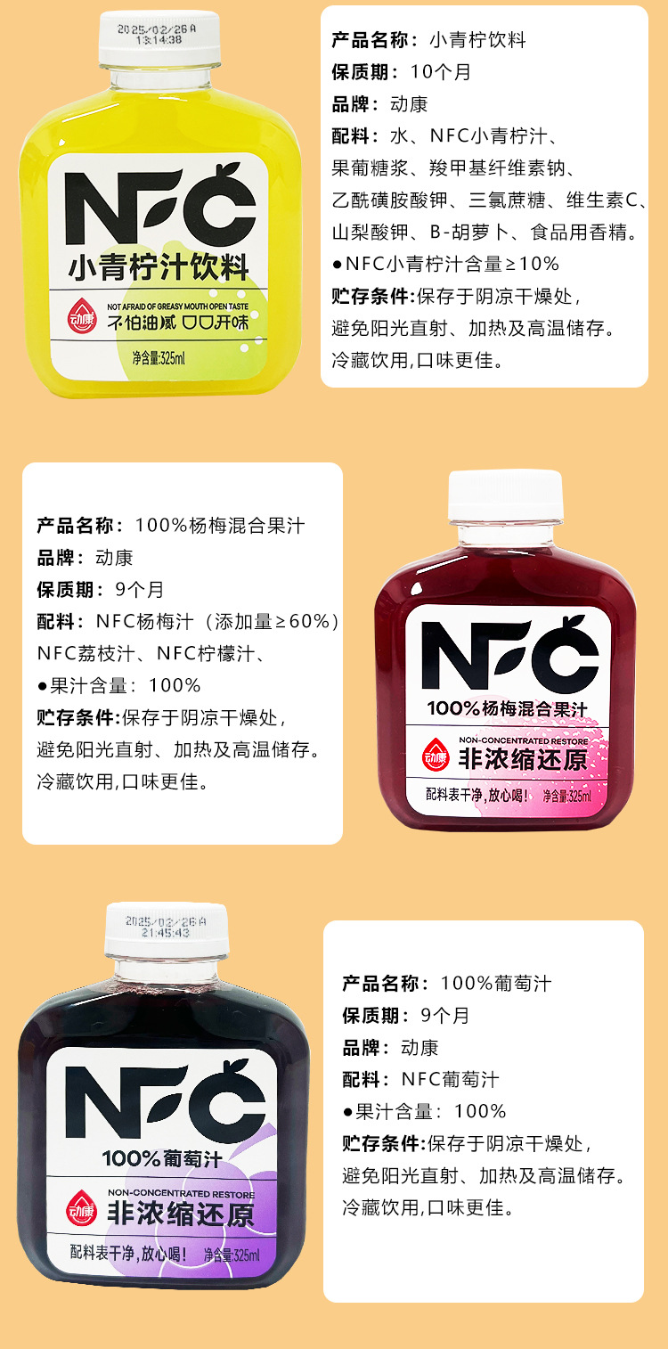 动康NFC葡萄汁325ml瓶装草莓汁还原100%苹果橙汁杨梅果汁饮料青柠