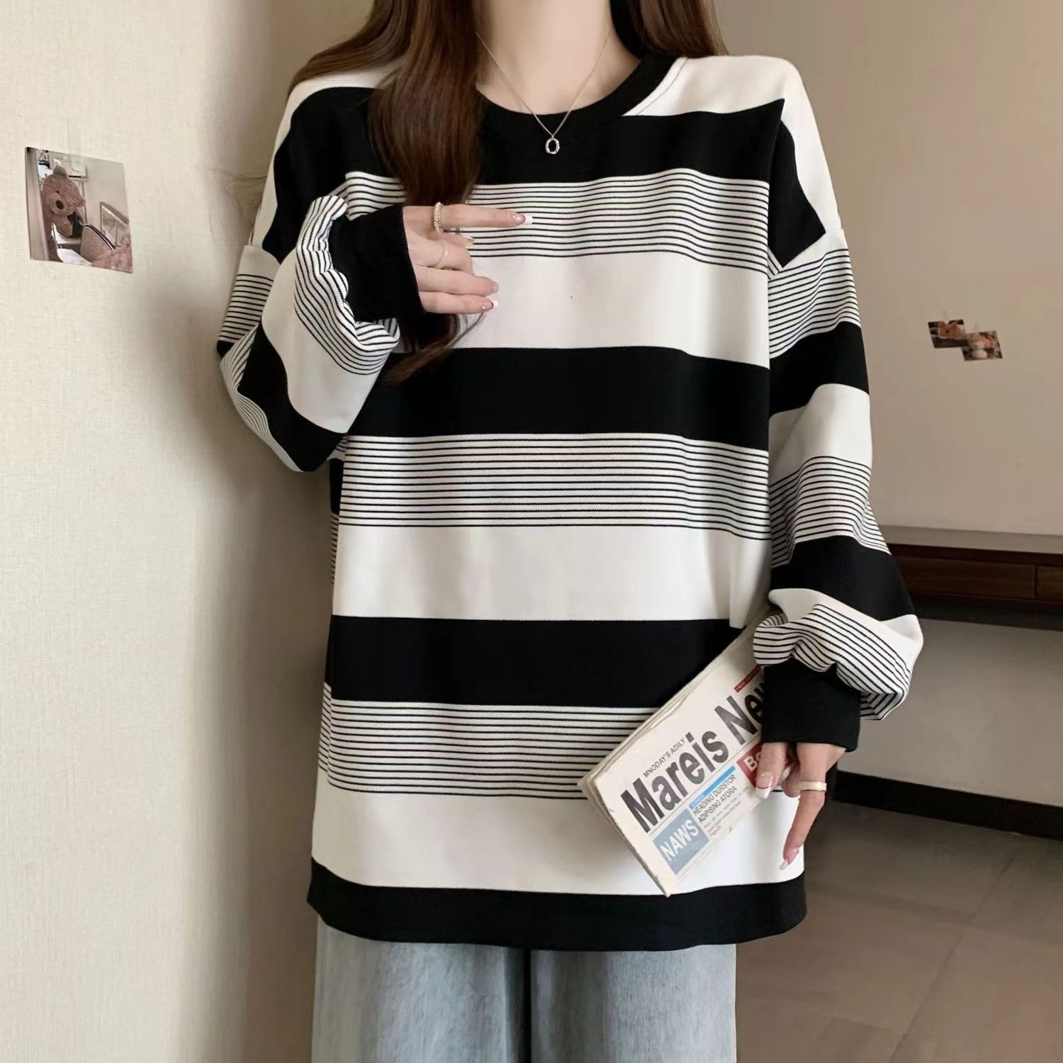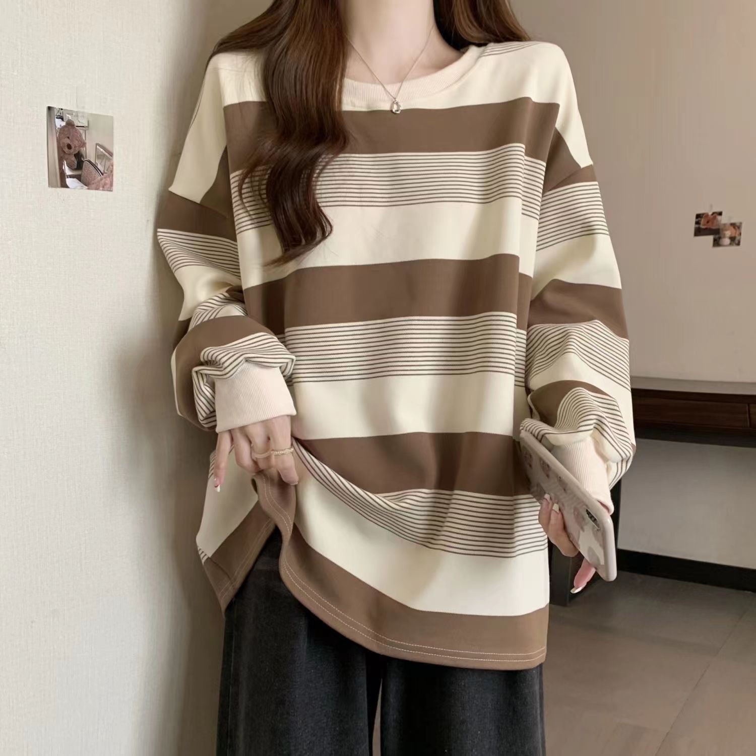 美式复古oversize条纹卫衣女春秋季薄款宽松bf慵懒风小众长袖上衣