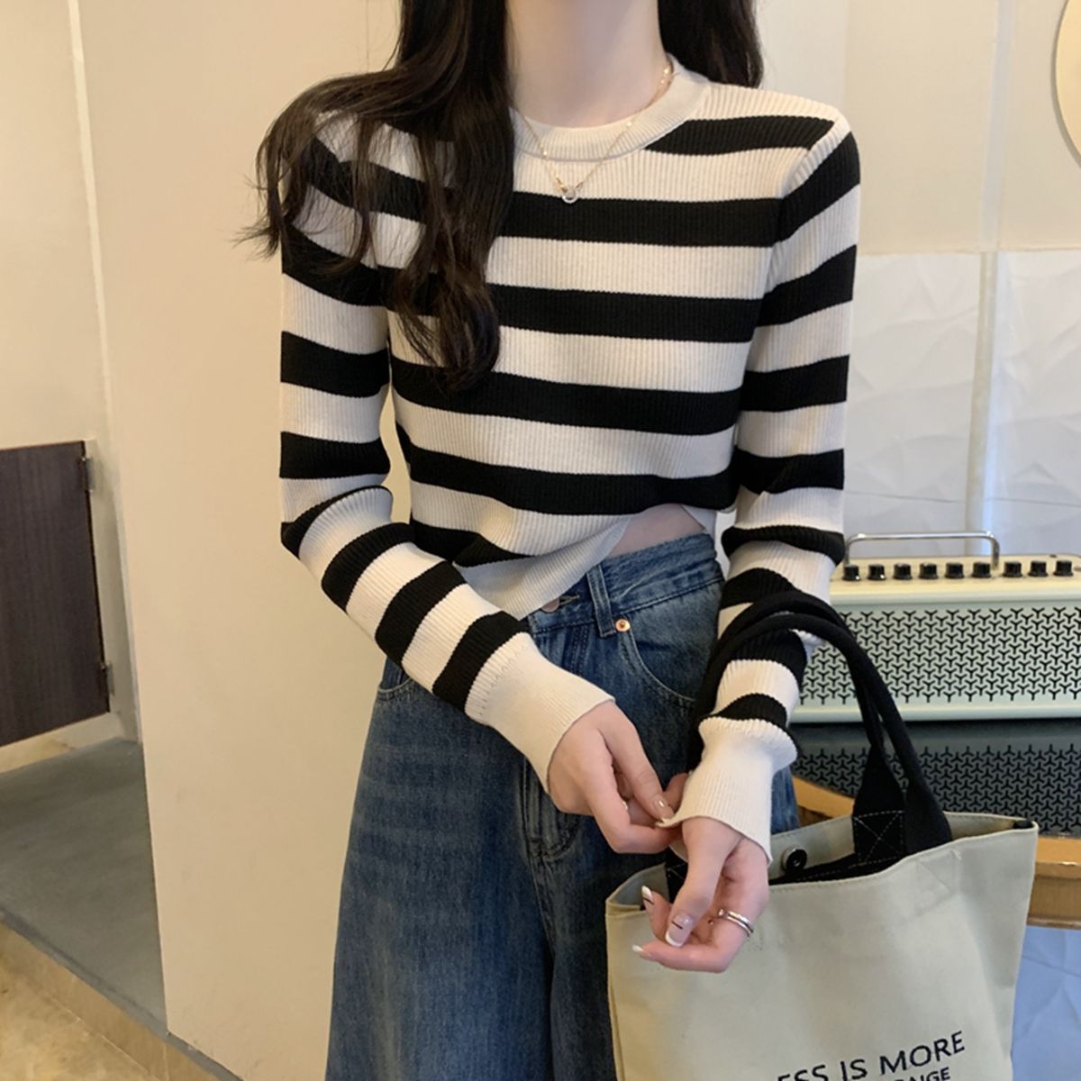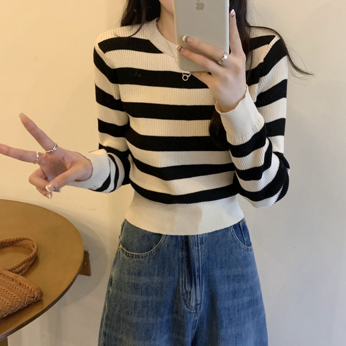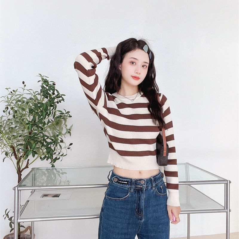 跨境条纹短款长袖针织衫内搭打底衫2024新款时尚简约显瘦百搭上衣