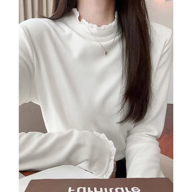 花边拼接半高领打底衫女秋冬双面磨毛修身设计感针织衫内搭上衣女